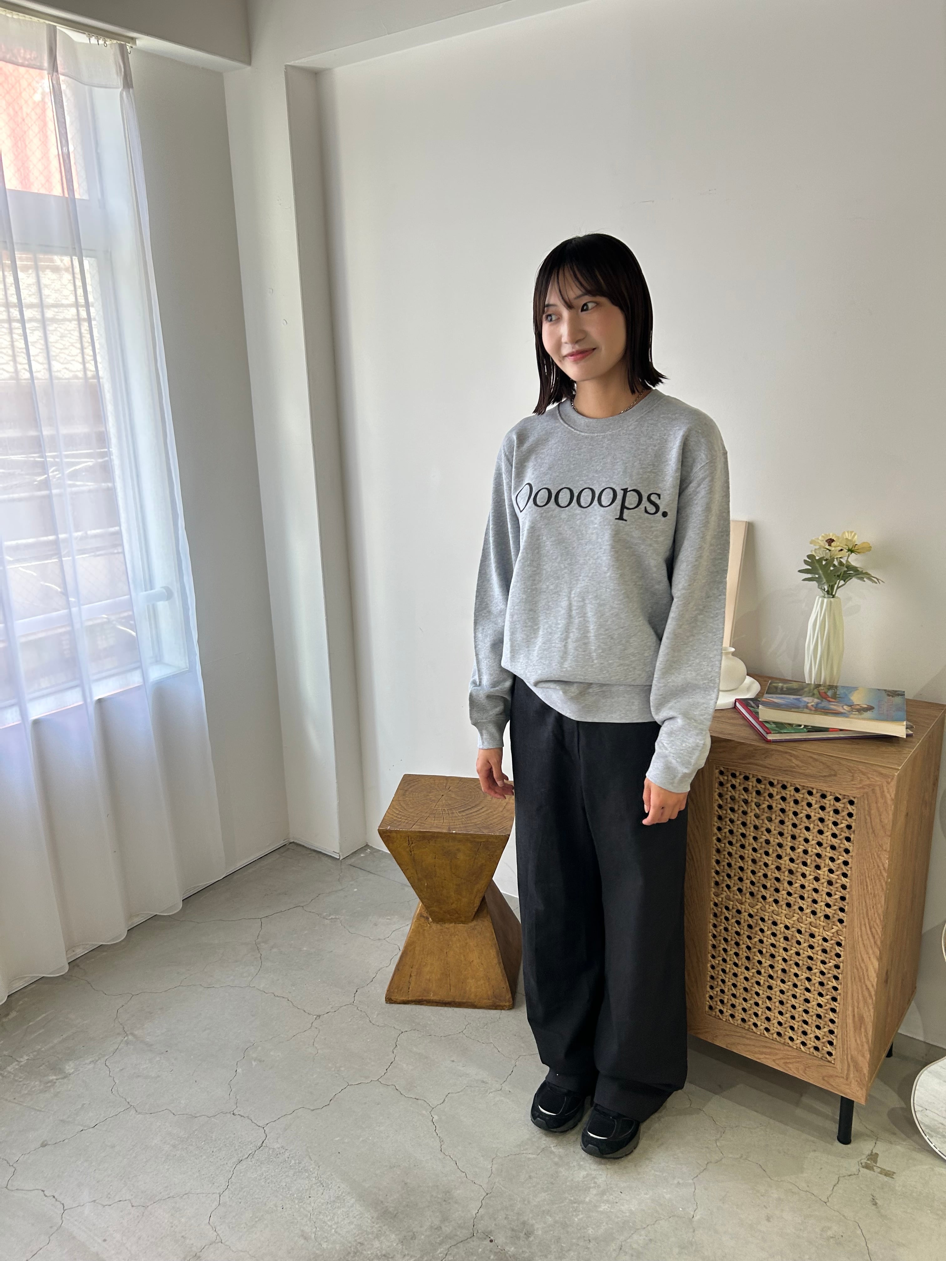 10oz , コットン100%のスウェット”Ooooops.”と大きくシルクスクリーンプリントを施しております。