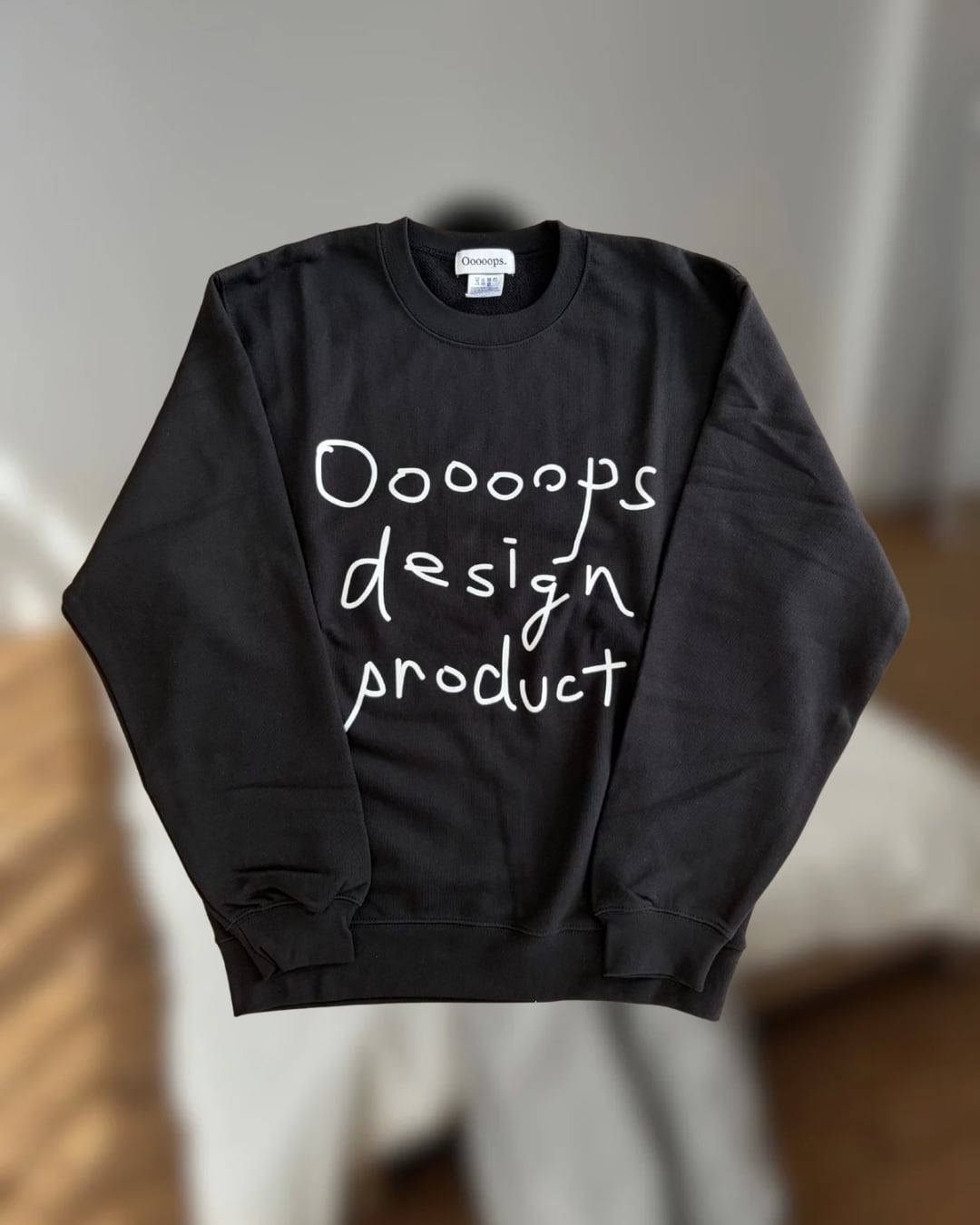 10oz , コットン100%のスウェットに”Ooooops design product”と手書きグラフィックを施しています。